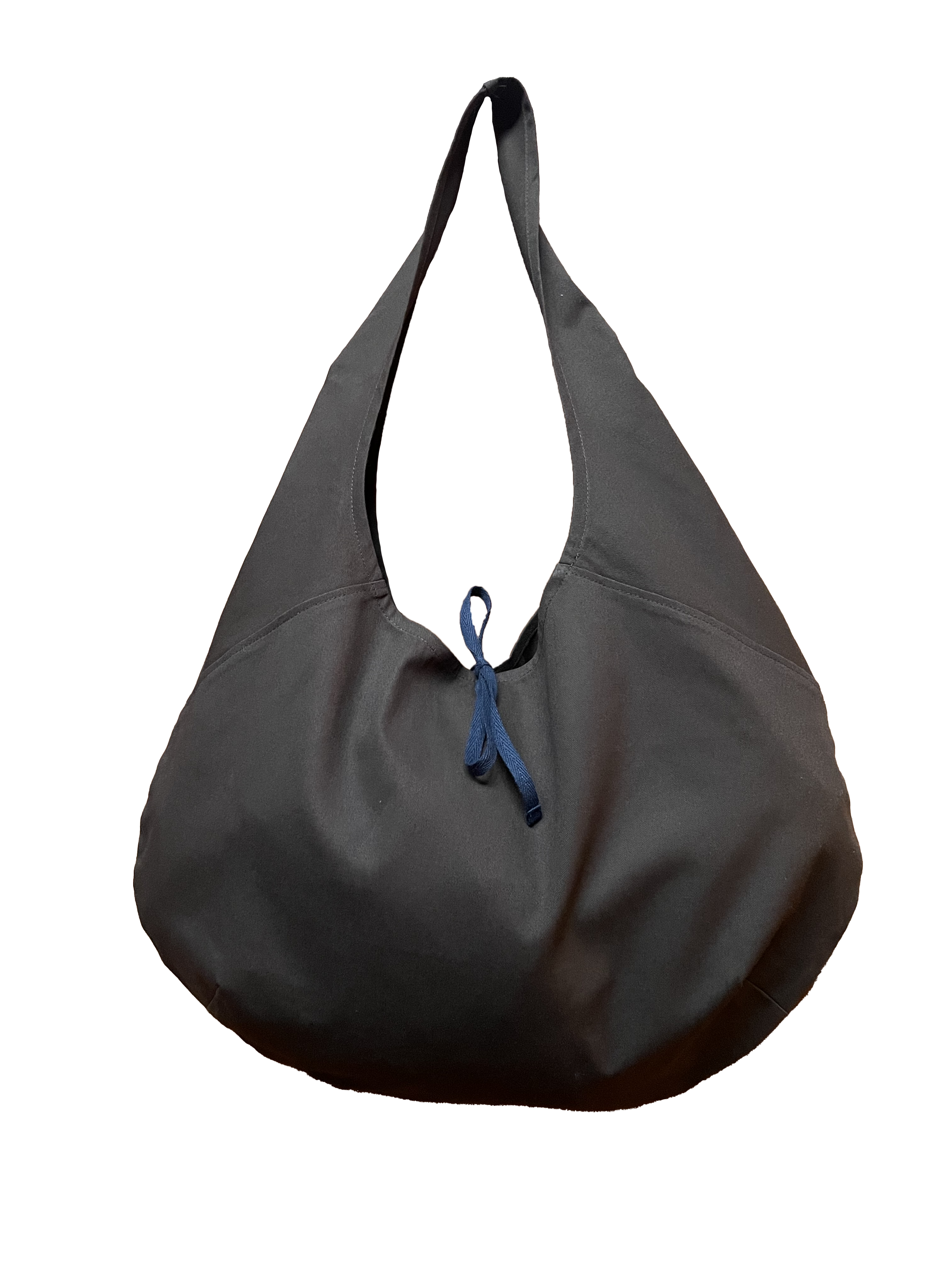 Cotton twill tape ties to close; the same strap hangs inside with a key ring attached so you won’t have to dig around for 5 minutes at your door for your keys. 2 darts at the bottom afford some extra cargo capacity. Can be worn on the shoulder or as a crossbody.